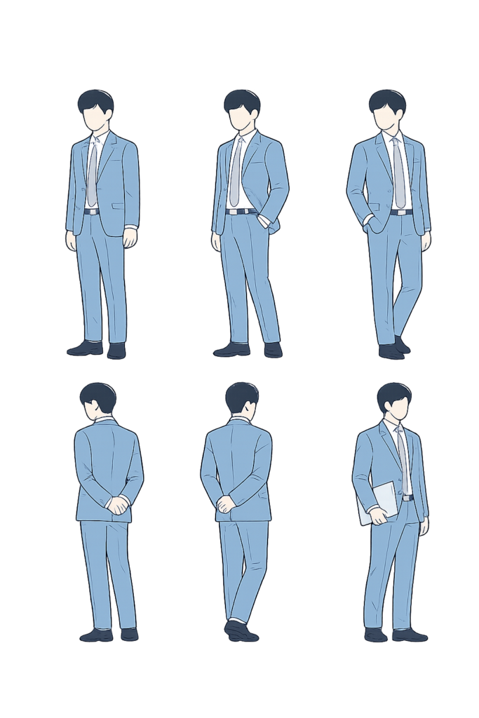 スーツ姿の男性の立ち姿イラスト素材(6パターン)です。