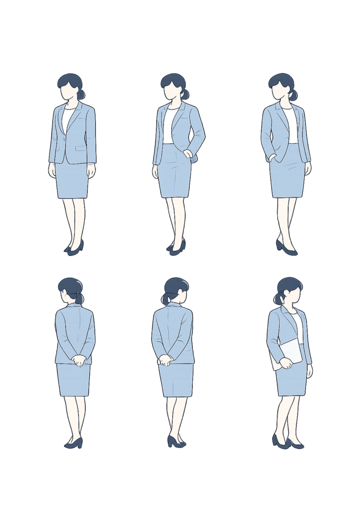 スーツ姿の女性の立ち姿イラスト素材(6パターン)です。