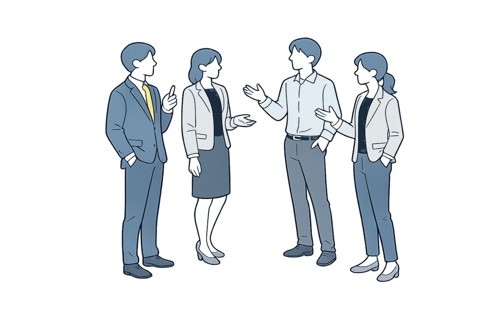 ポケットに手を入れて話し、かなりラフな打合せですね。